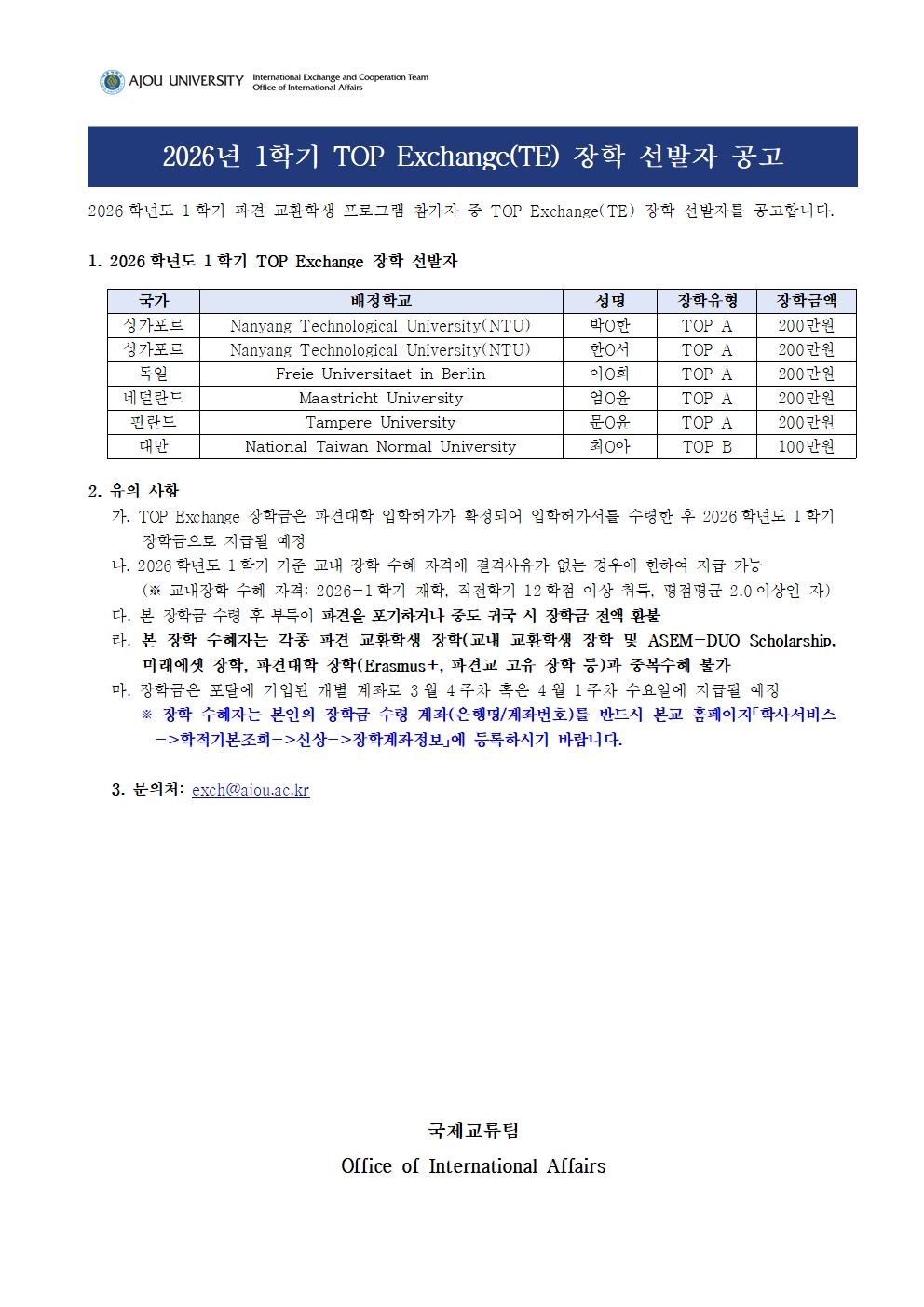 [공지] 2026-1학기 파견 교환학생 장학 선발자 발표(TE, GE, GC)